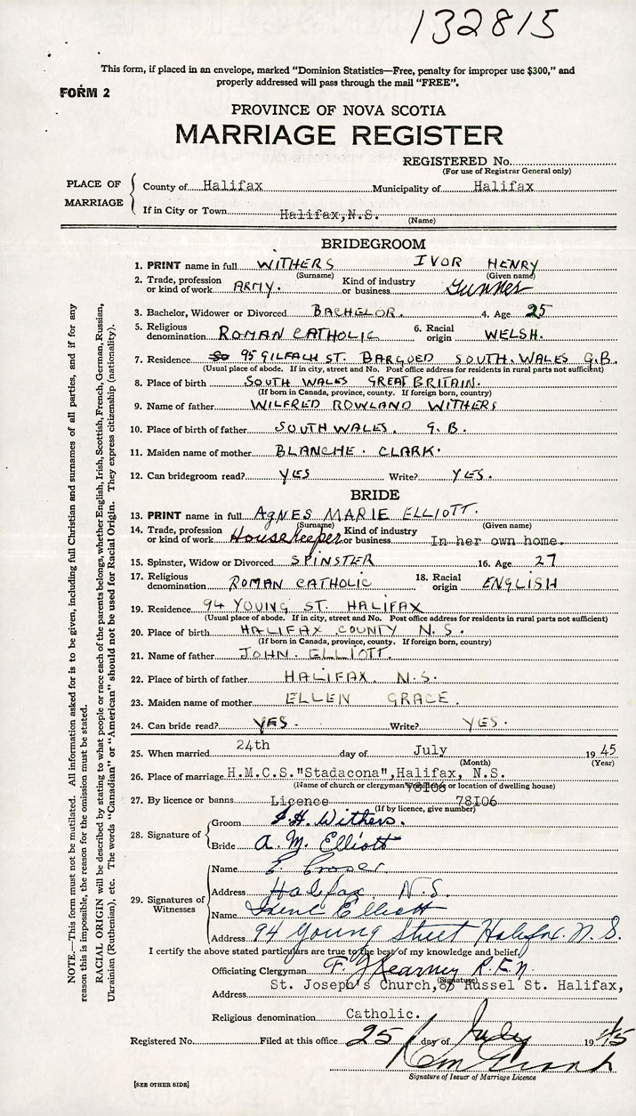 26. Place of marriage H.M.C.S. "Stadacona" Halifax, Halifax County