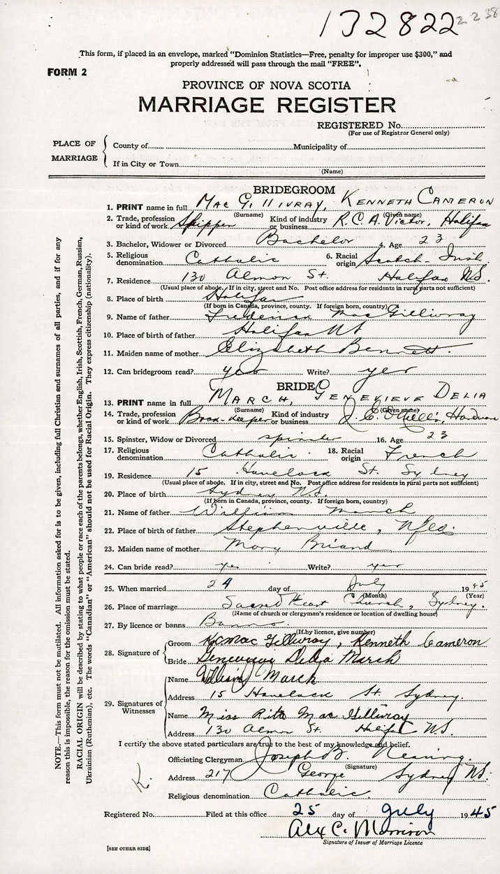 PLACE OF MARRIAGE County of Cape Breton in City or Town Sydney
