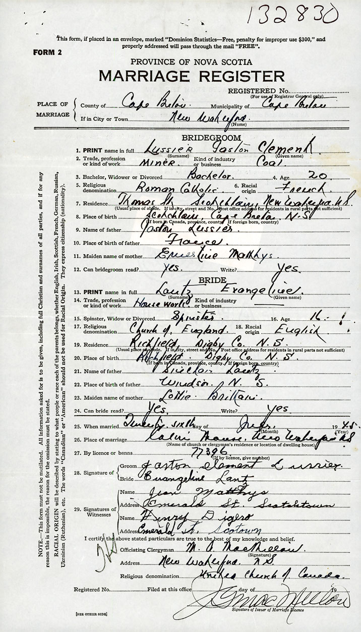 PLACE OF MARRIAGE County of Cape Breton in City or Town New Waterford