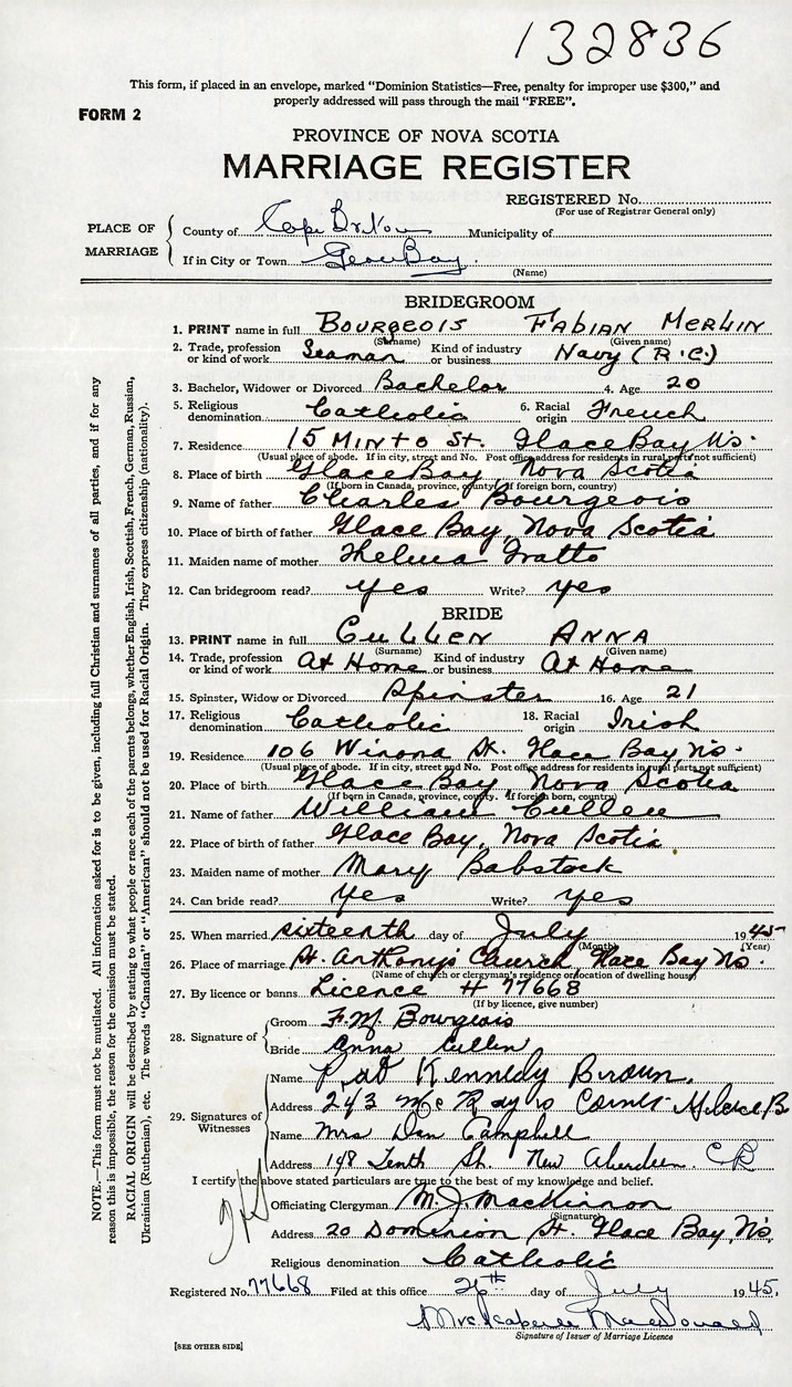 PLACE OF MARRIAGE County of Cape Breton in City or Town Glace Bay