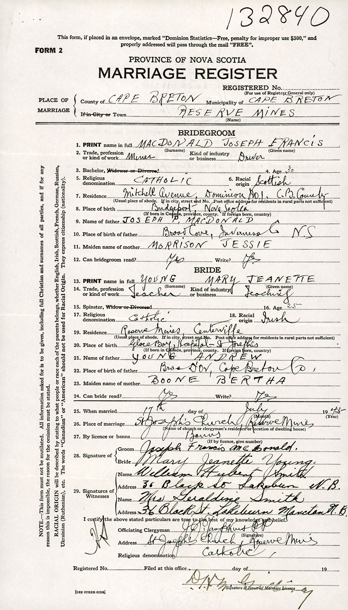 PLACE OF MARRIAGE County of Cape Breton in City or Town Reserve Mines