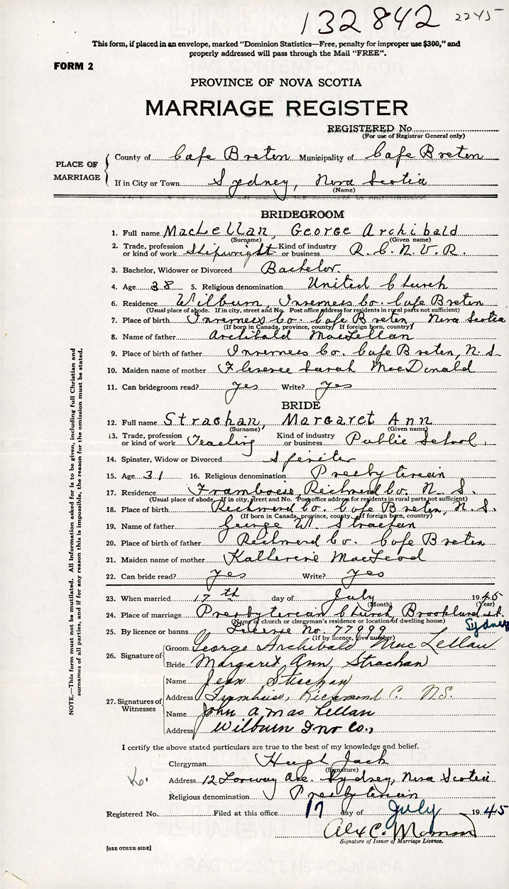 26. Place of marriage Presbyterian Church, Brookland St. Sydney, Cape Breton County