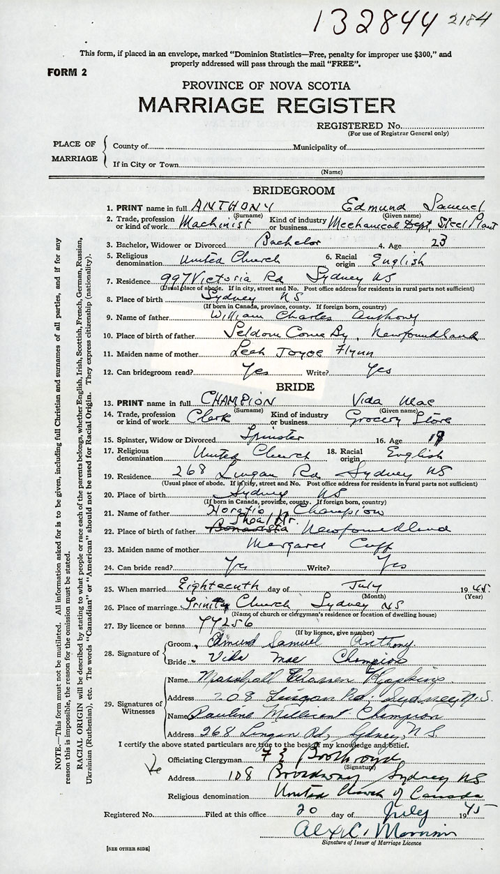 26. Place of marriage Trinity Church Sydney, Cape Breton County