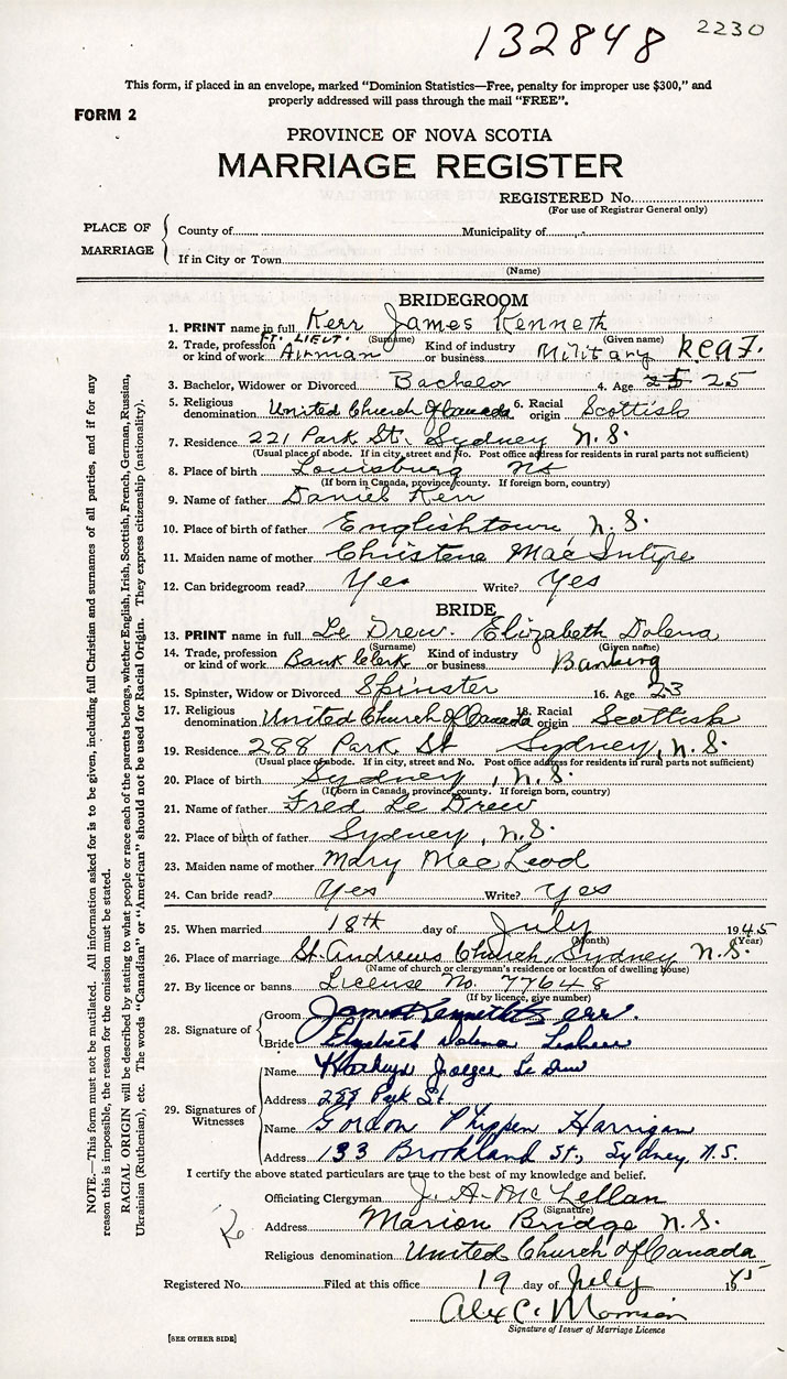 26. Place of marriage St. Andrews Church Sydney, Cape Breton County