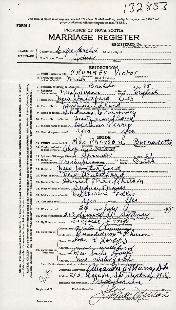 26. Place of marriage 213 Union st Sydney, Cape Breton County