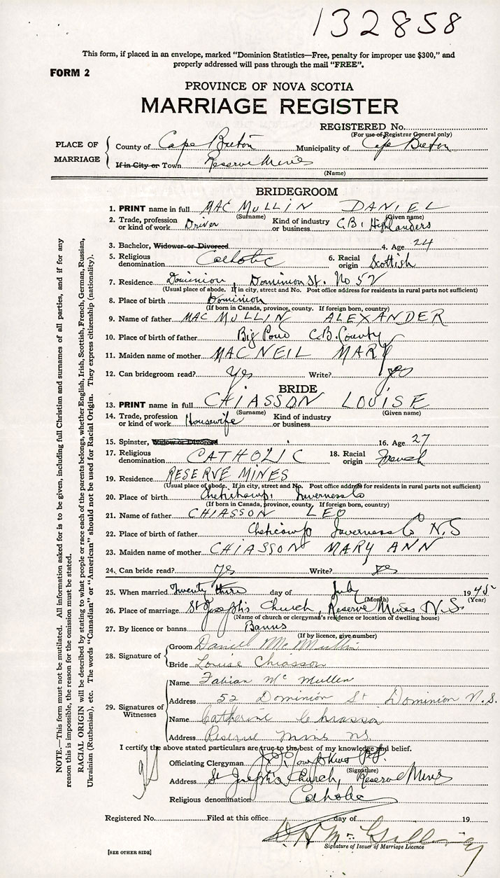 PLACE OF MARRIAGE County of Cape Breton in City or Town Reserve Mines