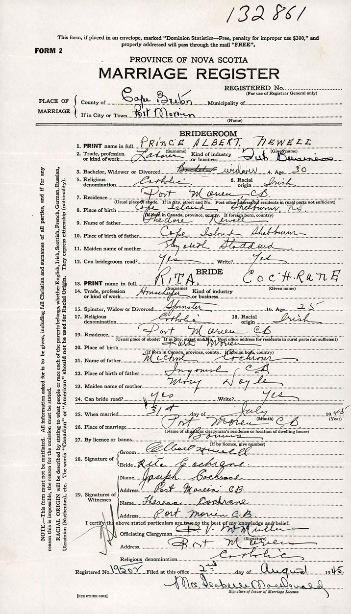 26. Place of marriage Port Morien, Cape Breton County