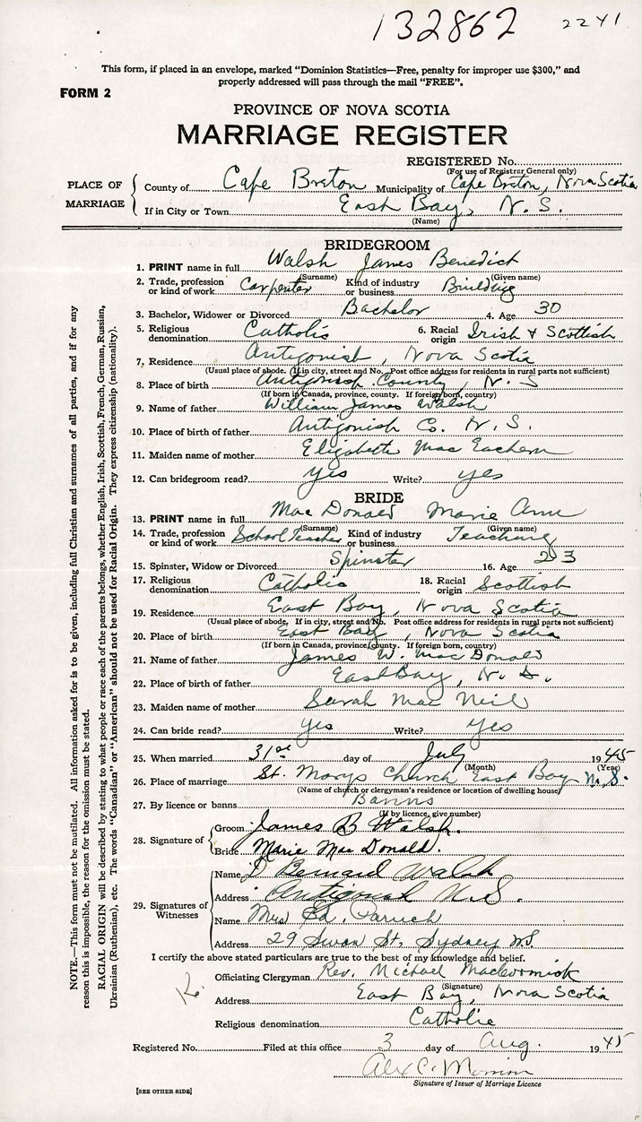 26. Place of marriage St. Mary's Church East Bay, Cape Breton County