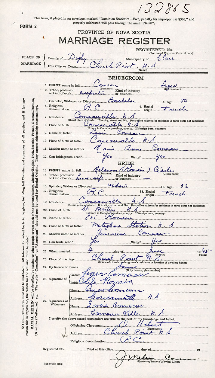 PLACE OF MARRIAGE County of Digby in City or Town Church Point