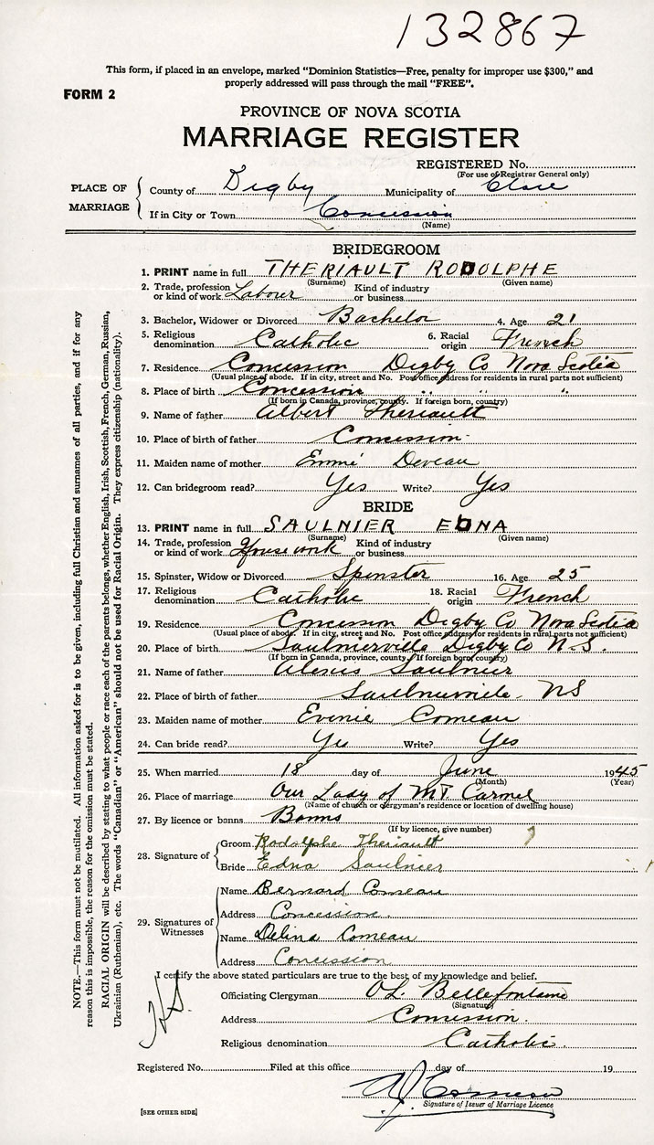 26. Place of marriage Our Lady of Mt. Carmel Concession, Digby County