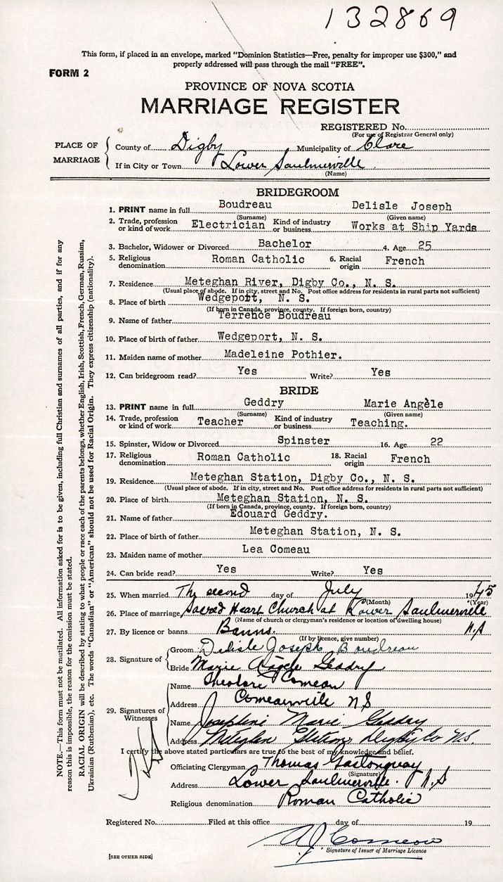 26. Place of marriage Sacred Heart Church Lower Saulnierville, Digby County
