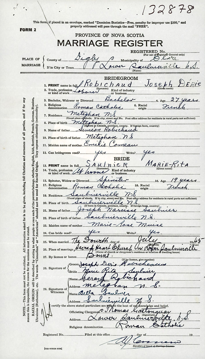 26. Place of marriage Sacred Heart Church Lower Saulniervulle, Digby County