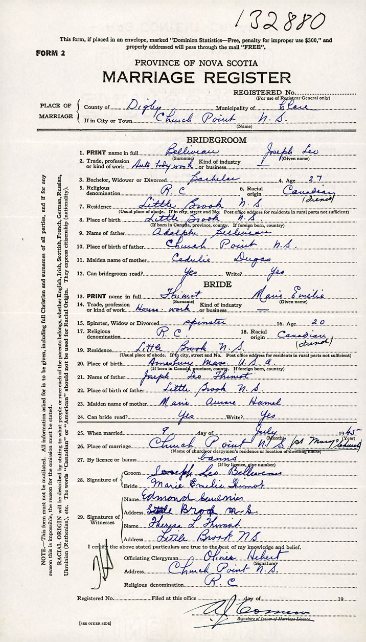 PLACE OF MARRIAGE County of Digby in City or Town Church Point