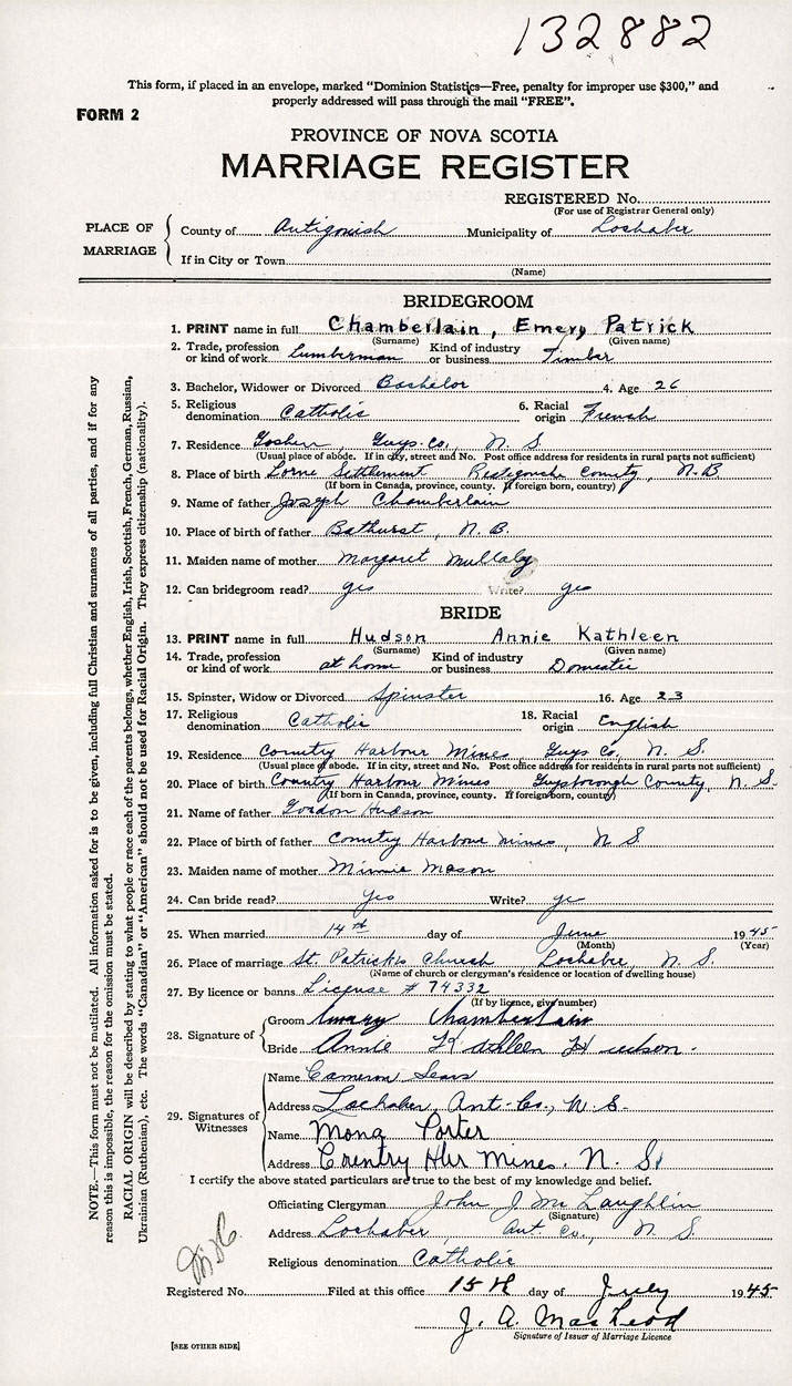 PLACE OF MARRIAGE County of Antigonish in City or Town Lochaber