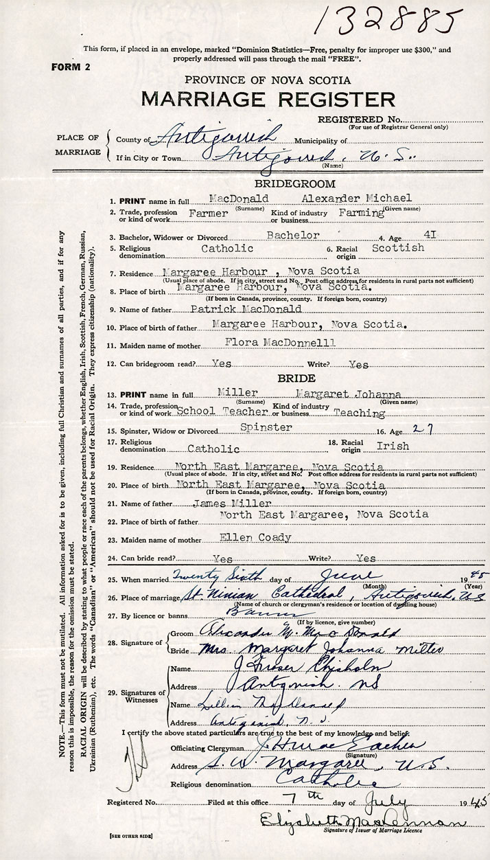 PLACE OF MARRIAGE County of Antigonish in City or Town Antigonish