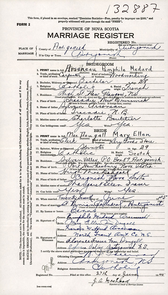 PLACE OF MARRIAGE County of Antigonish in City or Town Antigonish