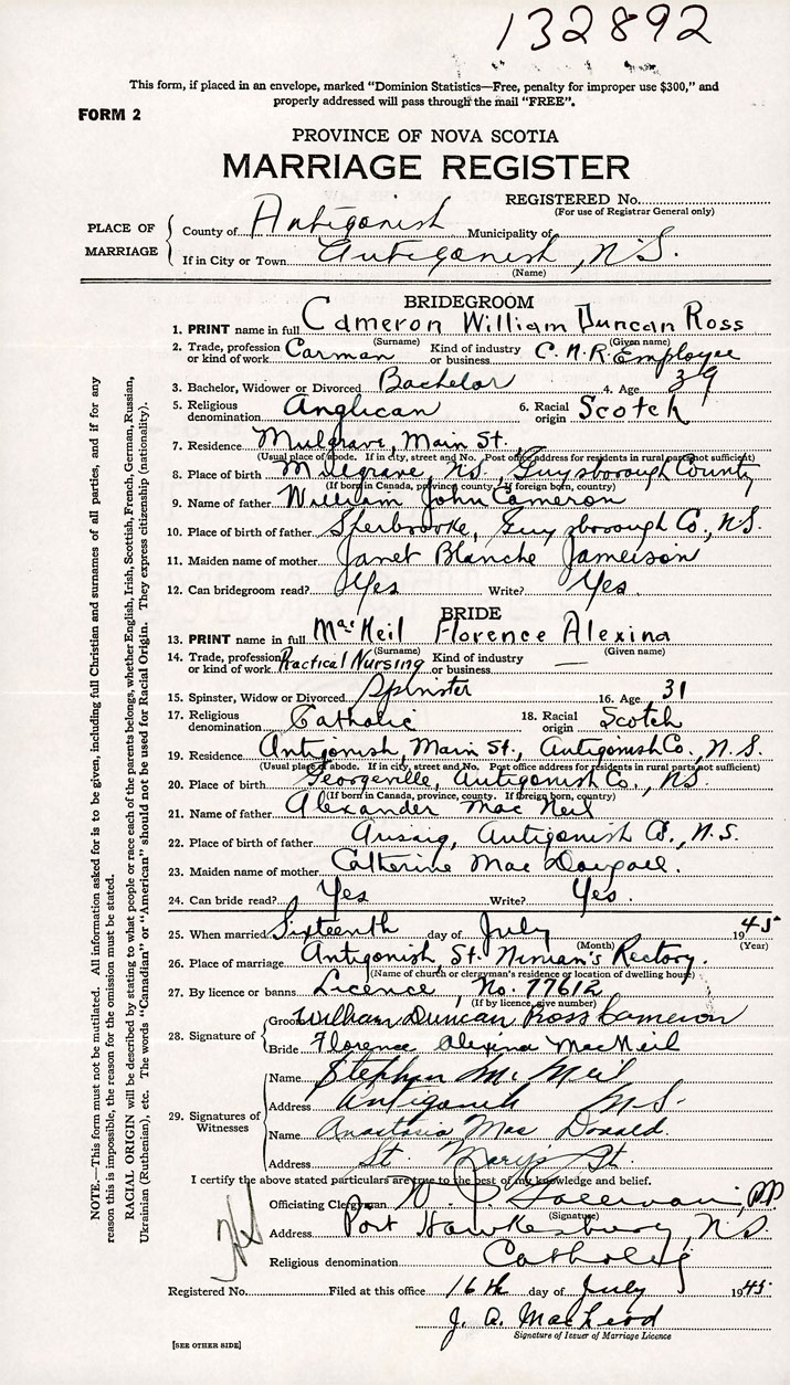 PLACE OF MARRIAGE County of Antigonish in City or Town Antigonish