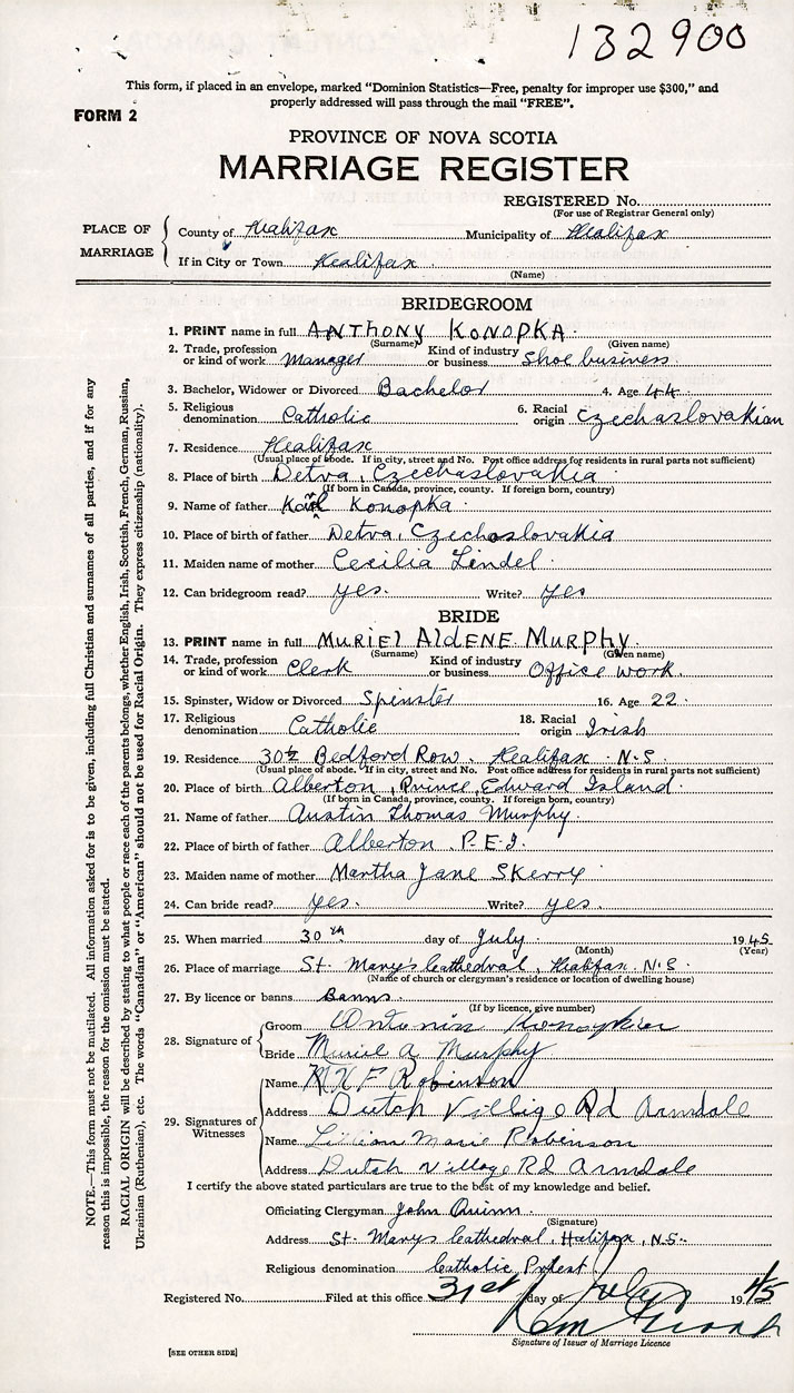 According to a certified copy of the Decree Absolute for Divorce dated 1965-12-15 and filed in the Office of the Registrar General under Divorce number 66-02-001006, it is ordered that the marriage of Anthony Konopka and Muriel Aldene Murphy (Registered under marriage number 1945-132900) be null and void.