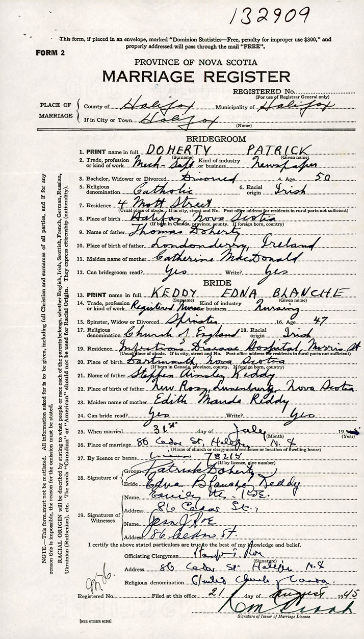 PLACE OF MARRIAGE County of Halifax in City or Town Halifax