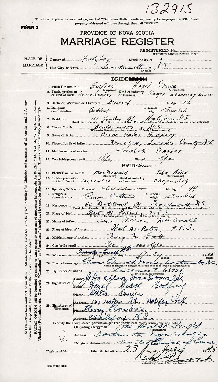 PLACE OF MARRIAGE County of Halifax in City or Town Dartmouth