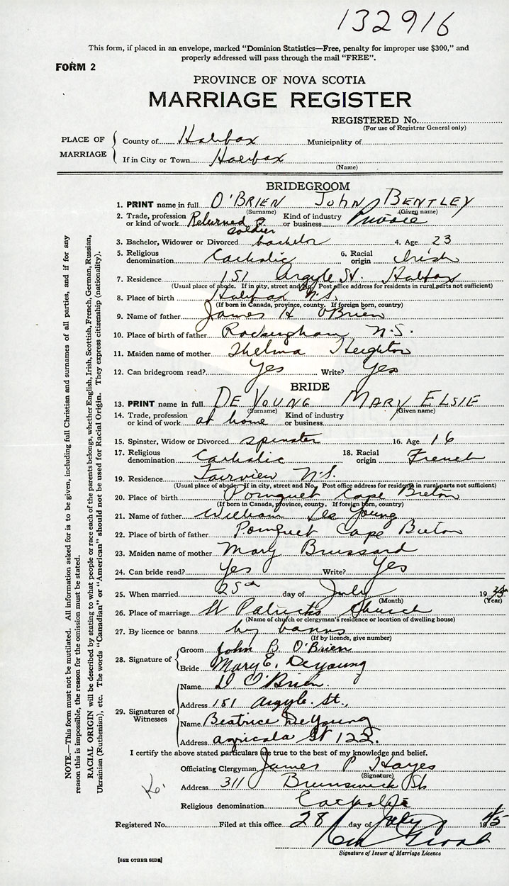 26. Place of marriage St Patrick's Church Halifax, Halifax County