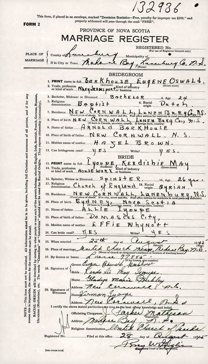 PLACE OF MARRIAGE County of Lunenburg in City or Town Mahone Bay