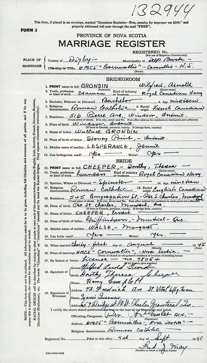 26. Place of marriage H.M.C.S. Cornwallis Cornwallis, Digby County