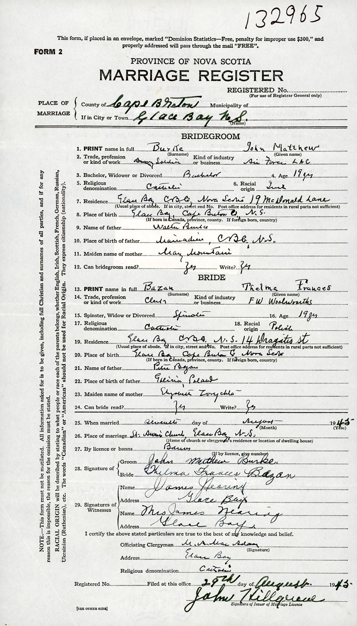 26. Place of marriage St. Anne's Church Glace Bay, Cape Breton County