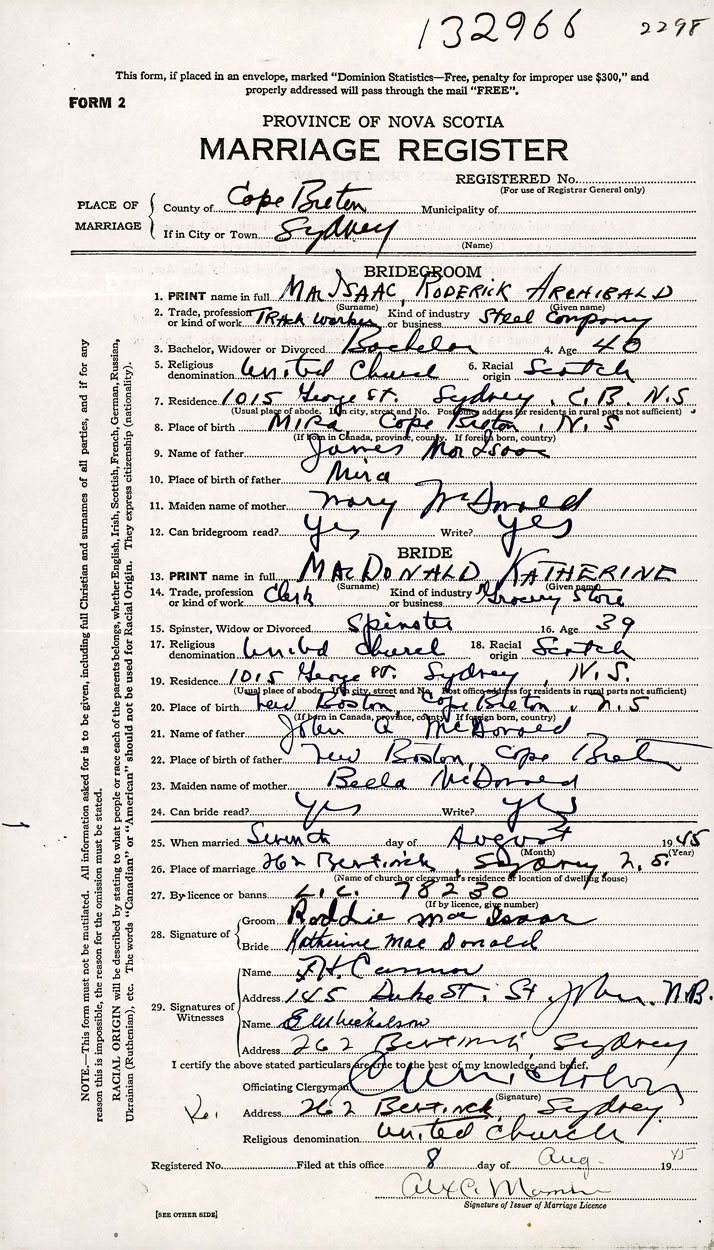 26. Place of marriage 262 Bentinck Street Sydney, Cape Breton County
