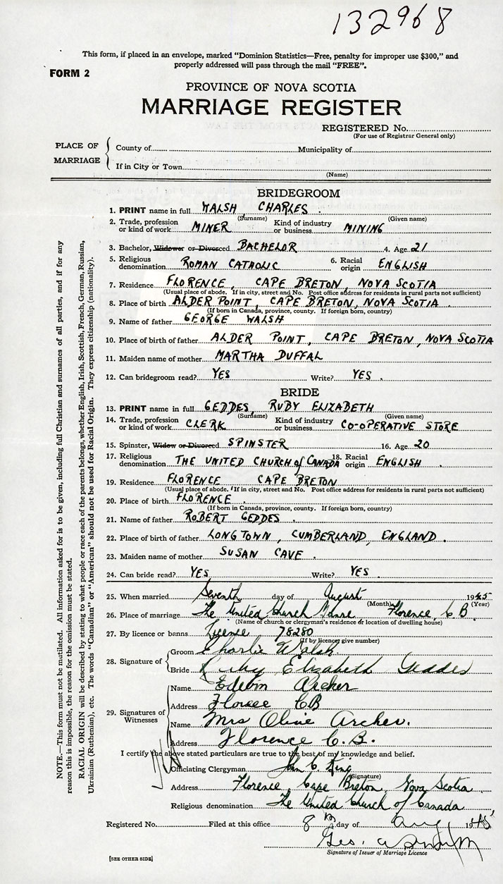 PLACE OF MARRIAGE County of Cape Breton in City or Town Florence