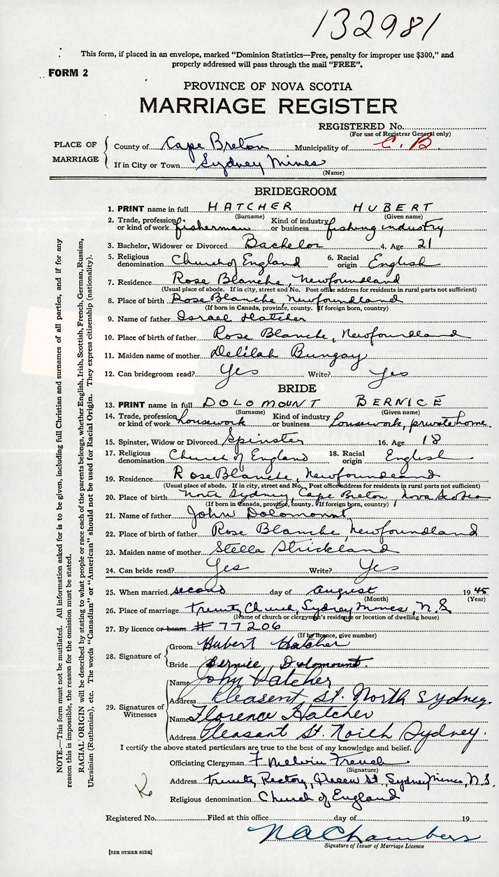 26. Place of marriage Trinity Church Sydney Mines NS, Cape Breton County
