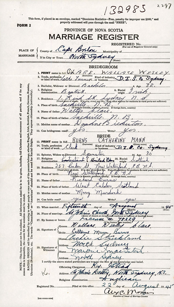 26. Place of marriage St Johns Church North Sydney, Cape Breton County