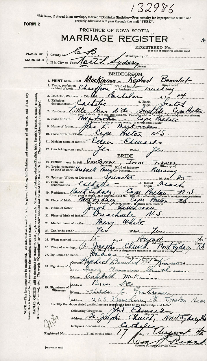 26. Place of marriage St Joseph's Church North Sydney, Cape Breton County