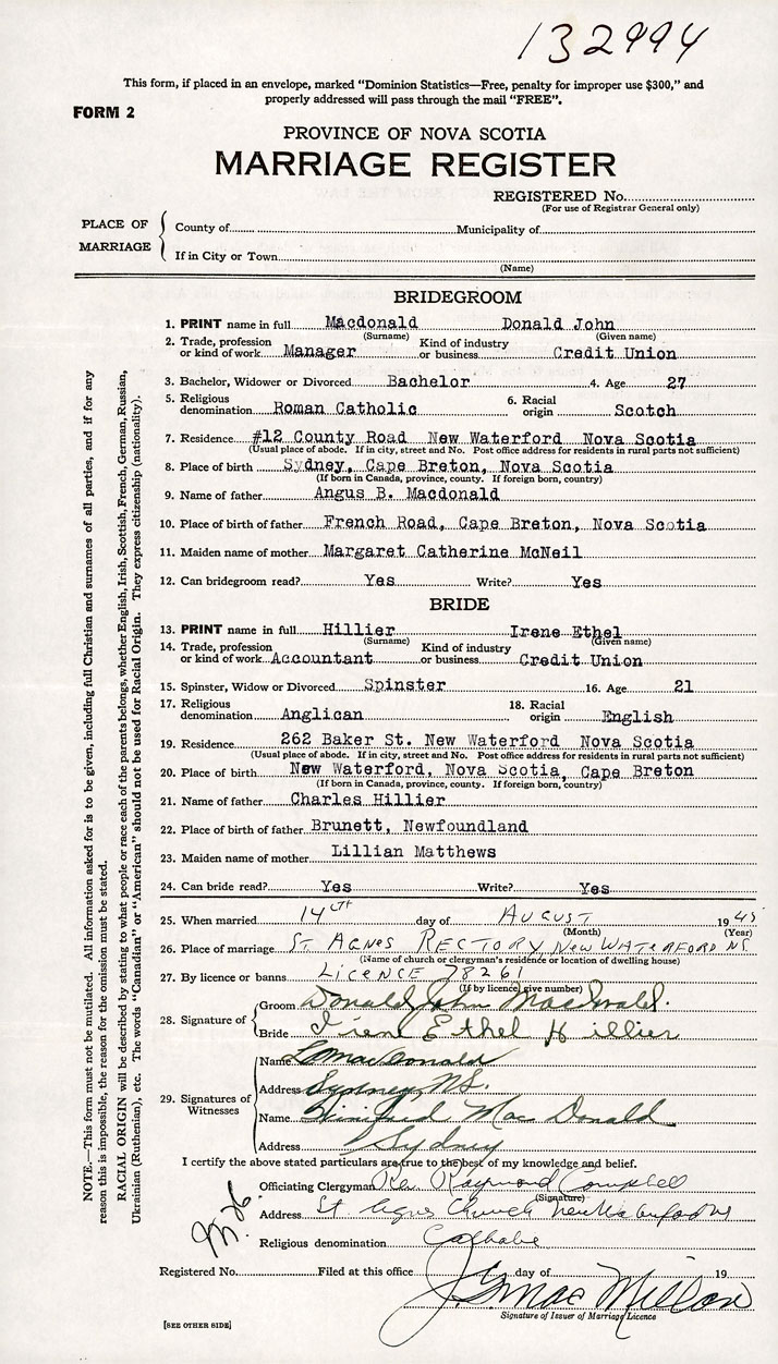 PLACE OF MARRIAGE County of Cape Breton in City or Town New Waterford