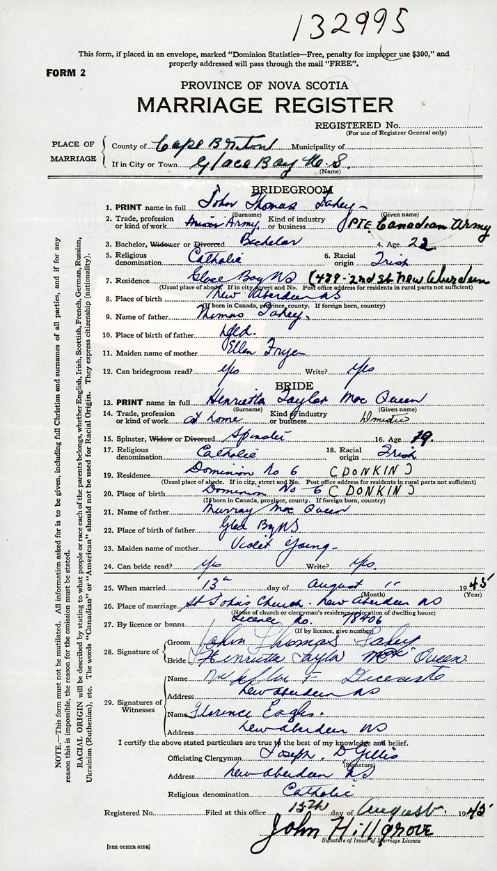 PLACE OF MARRIAGE County of Cape Breton in City or Town New Aberdeen