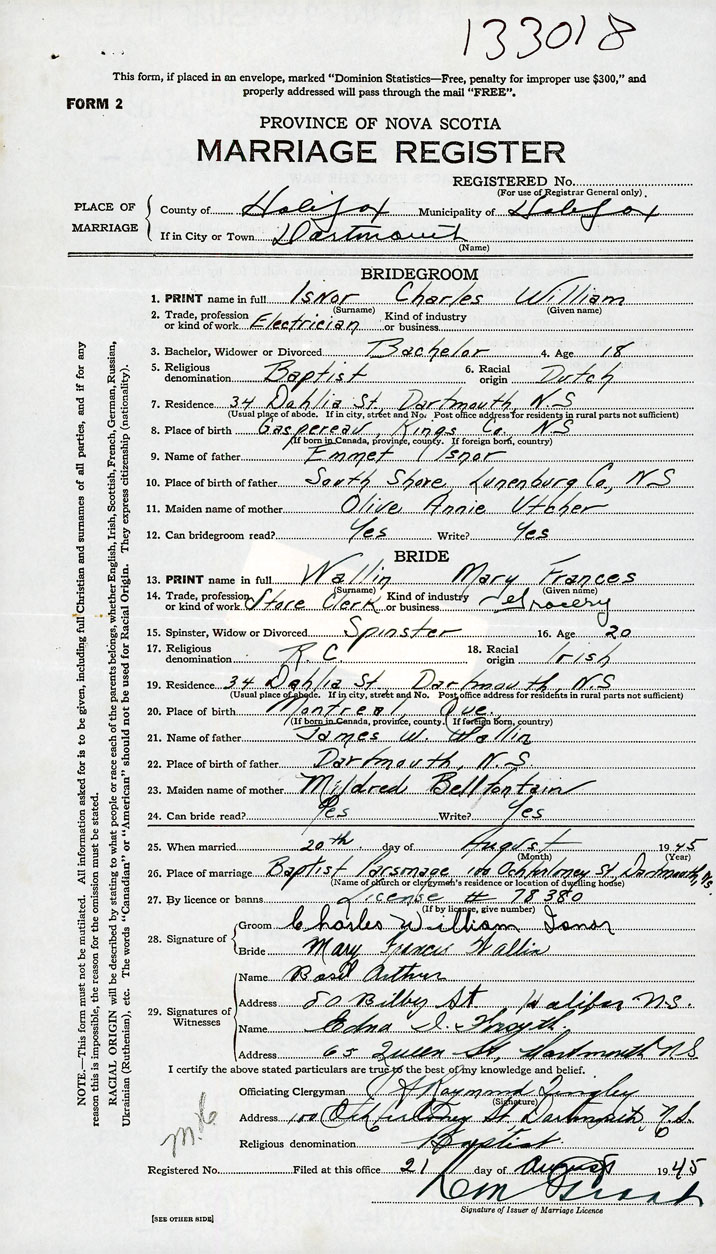 PLACE OF MARRIAGE County of Halifax in City or Town Dartmouth