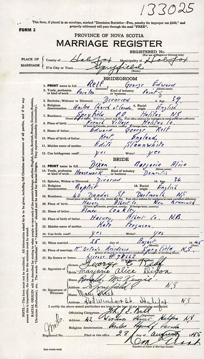 PLACE OF MARRIAGE County of Halifax in City or Town Spryfield