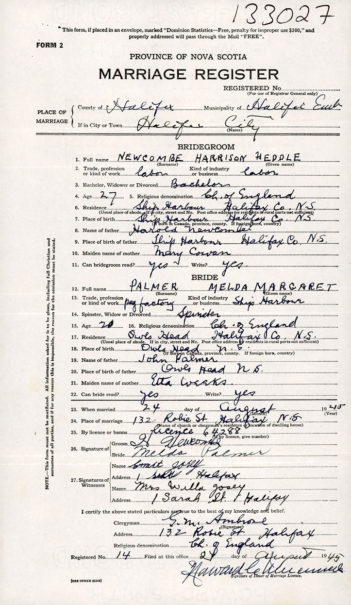 26. Place of marriage 132 Robie St. Halifax, Halifax County