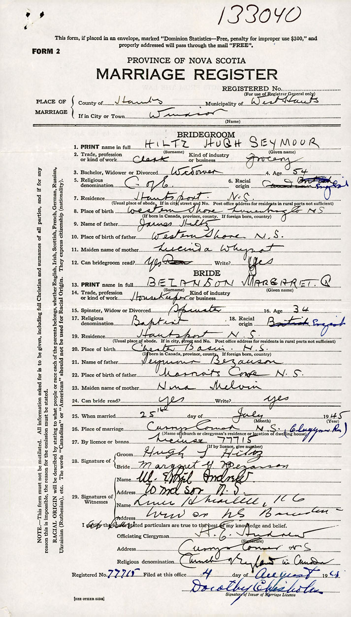 1. PRINT name in full Hiltz, Hugh Seymour