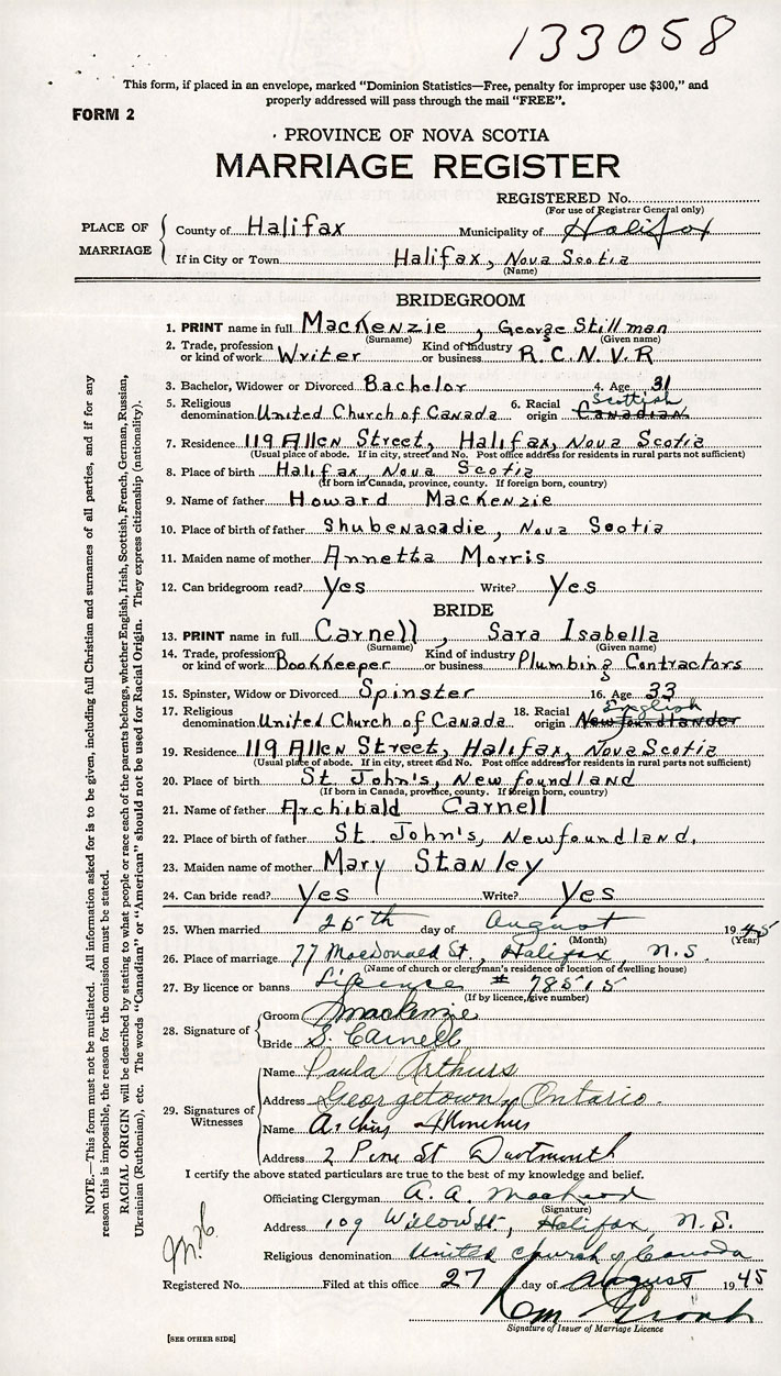 26. Place of marriage 77 MacDonald Street Halifax, Halifax County