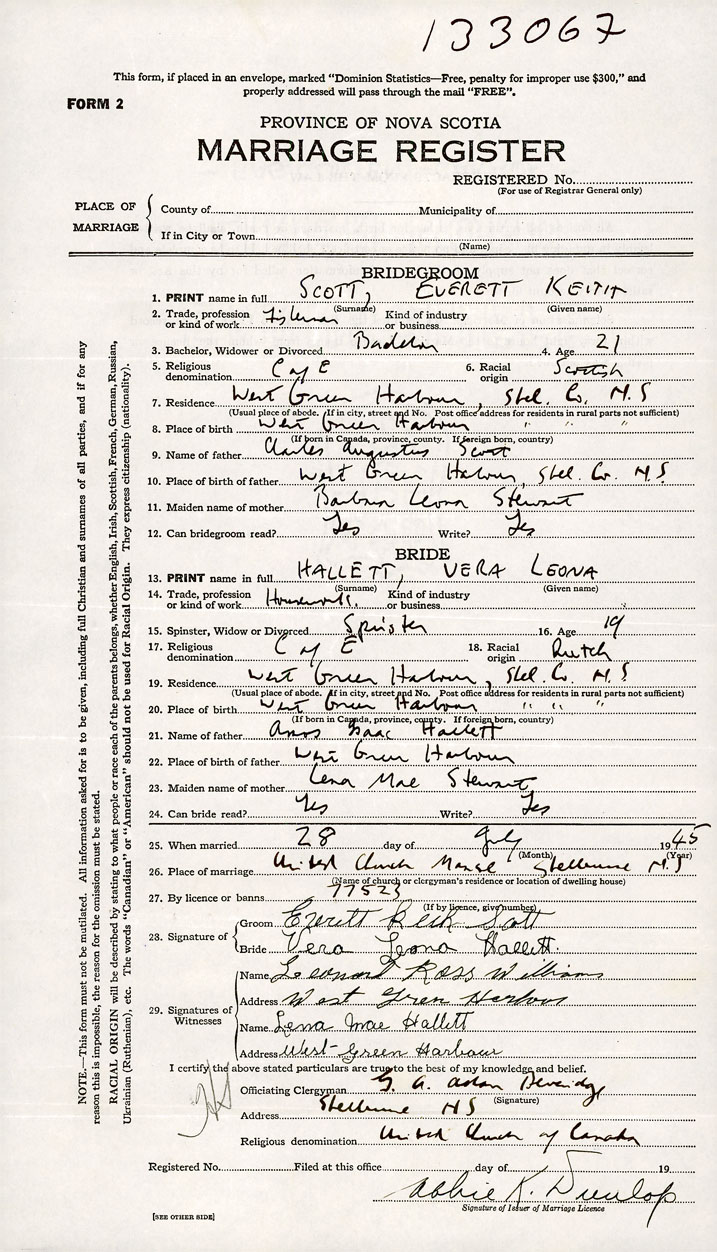 26. Place of marriage United Church Manse Shelburne, Shelburne County