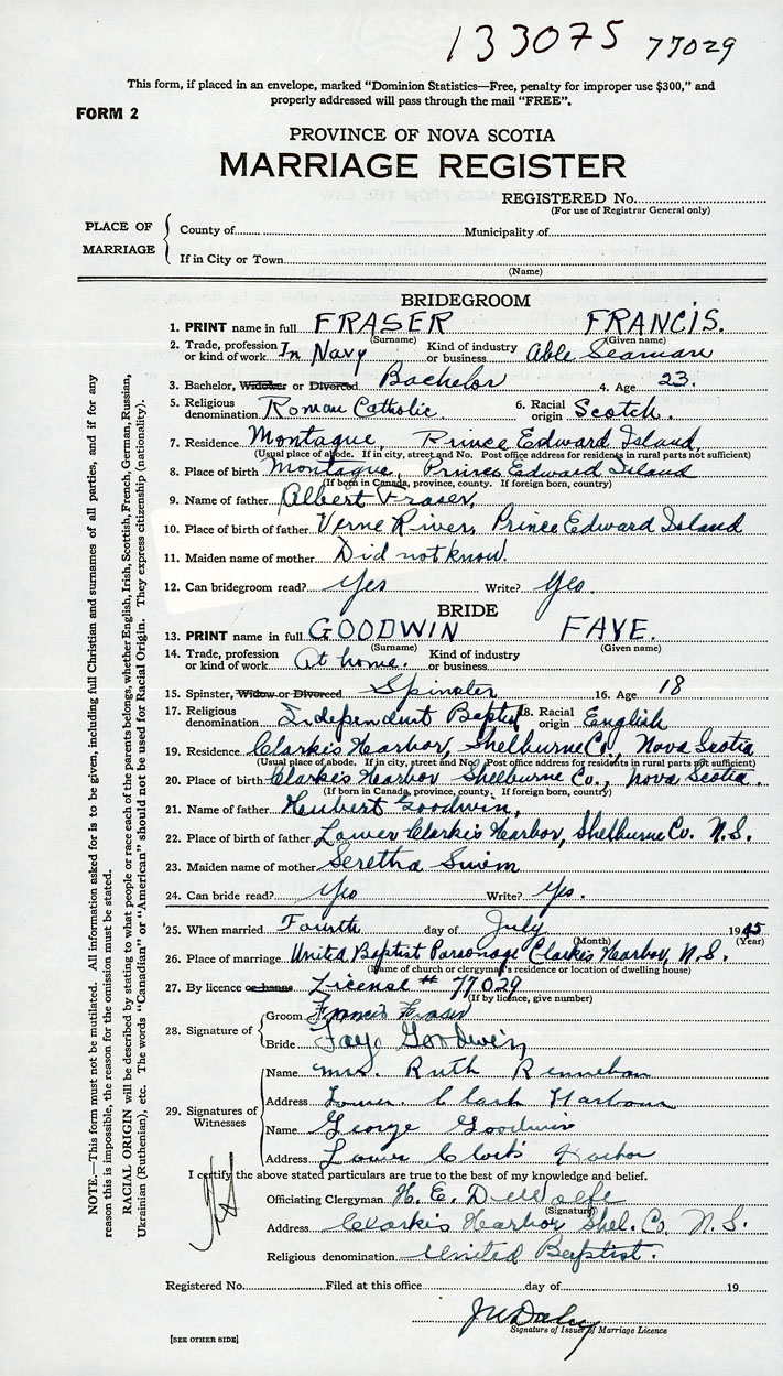 PLACE OF MARRIAGE County of Shelburne in City or Town Clarke's Harbour