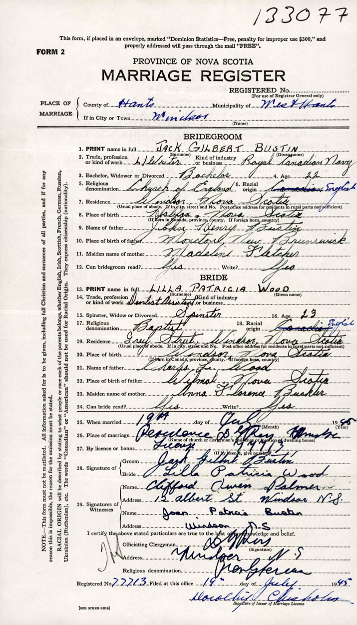 PLACE OF MARRIAGE County of Hants in City or Town Windsor