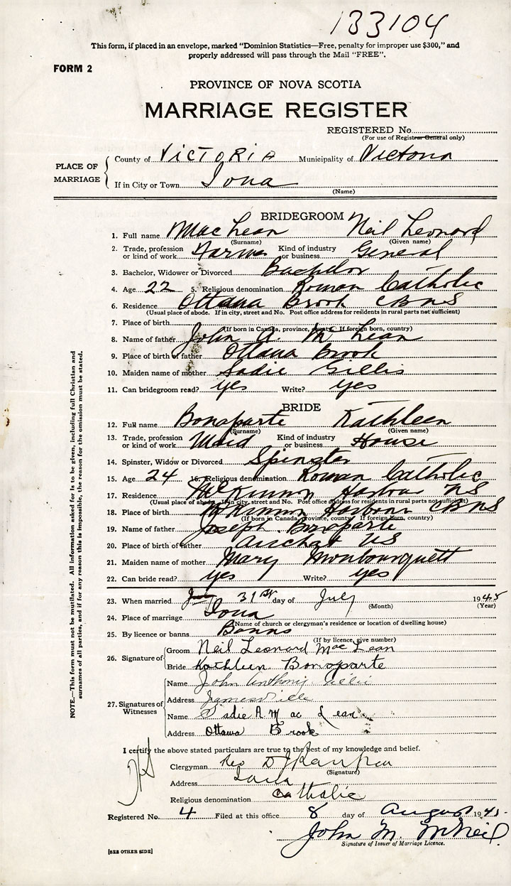 26. Place of marriage Iona Victoria, Victoria County