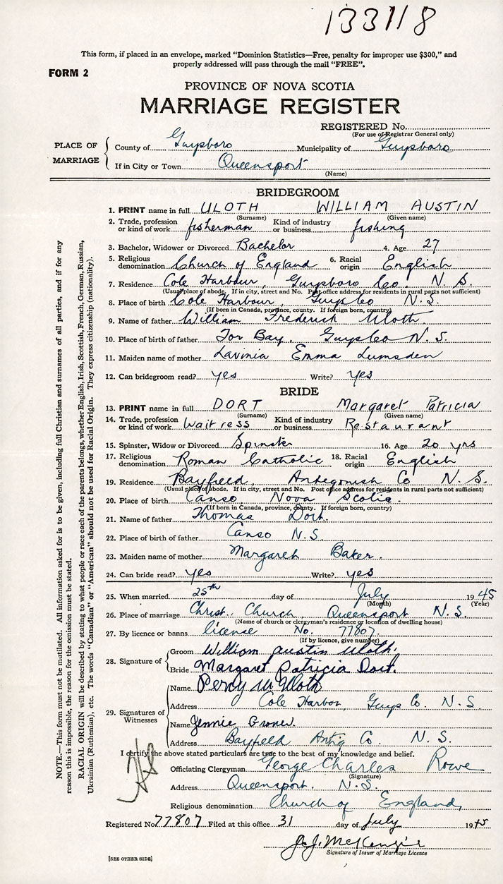 PLACE OF MARRIAGE County of Guysborough in City or Town Queensport