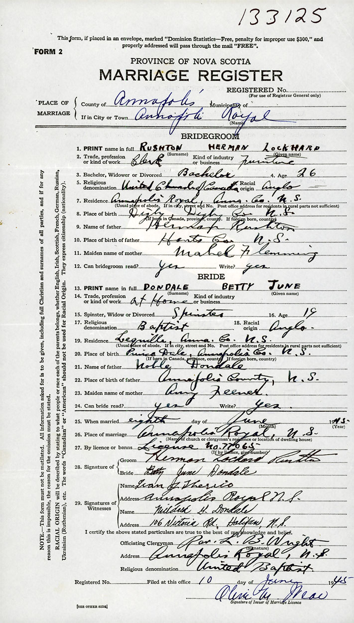 26. Place of marriage Annapolis Royal, Annapolis County