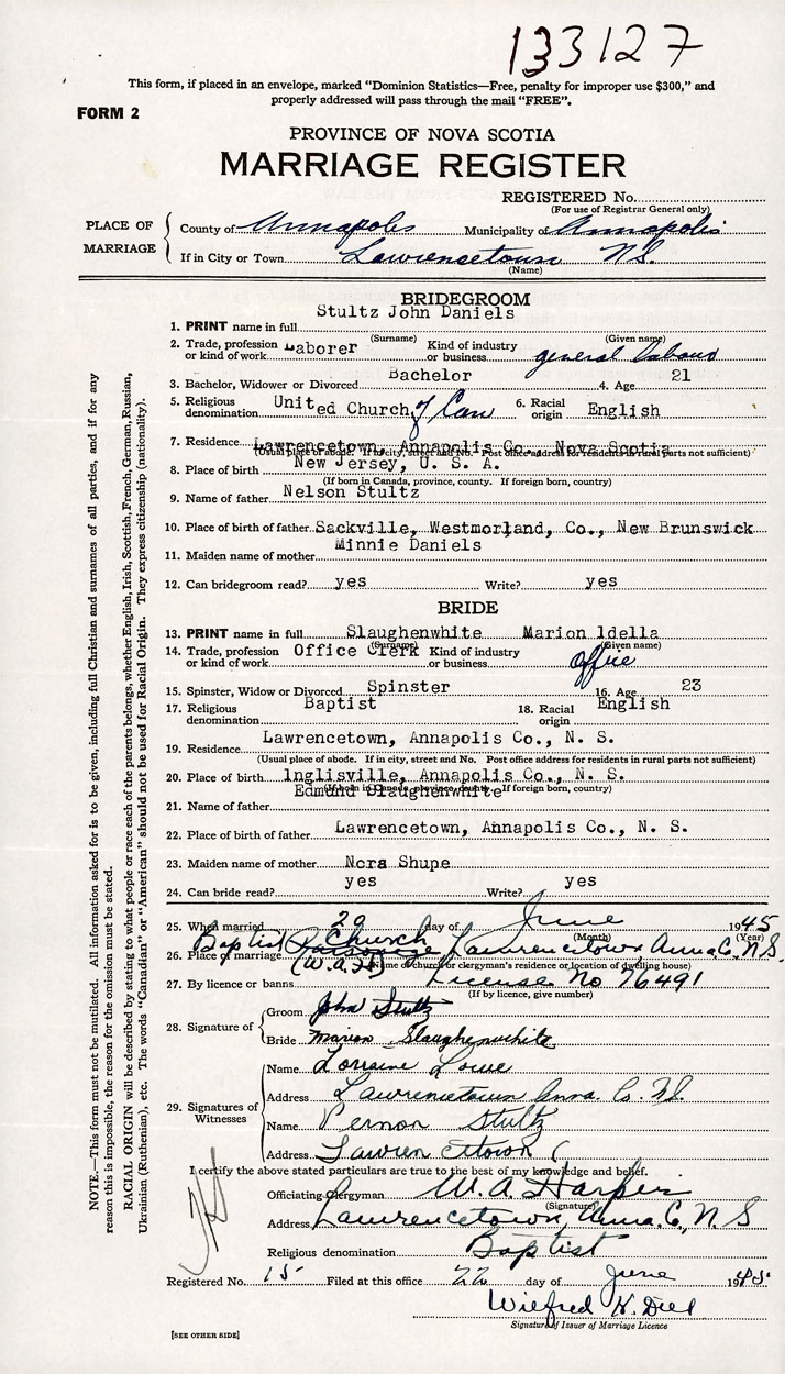 PLACE OF MARRIAGE County of Annapolis in City or Town Lawrencetown
