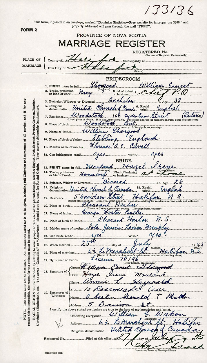 26. Place of marriage 6-1/2 LeMarchant St. Halifax, Halifax County