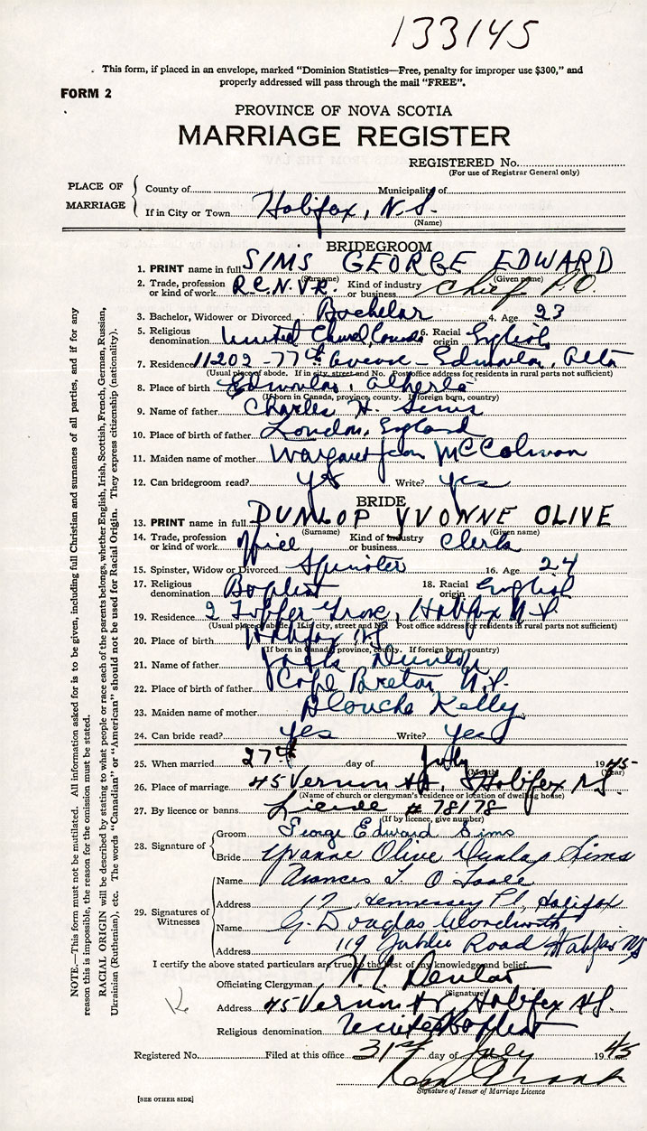 26. Place of marriage 45 Vernon St Halifax, Halifax County