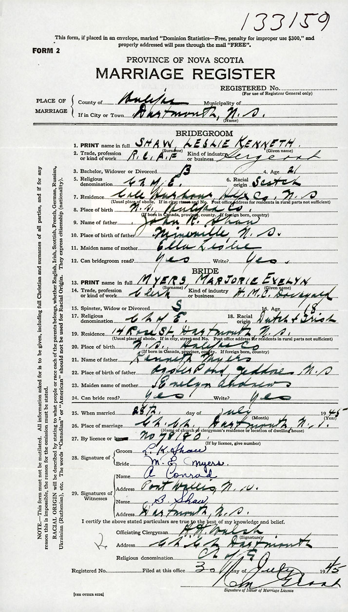 PLACE OF MARRIAGE County of Halifax in City or Town Dartmouth